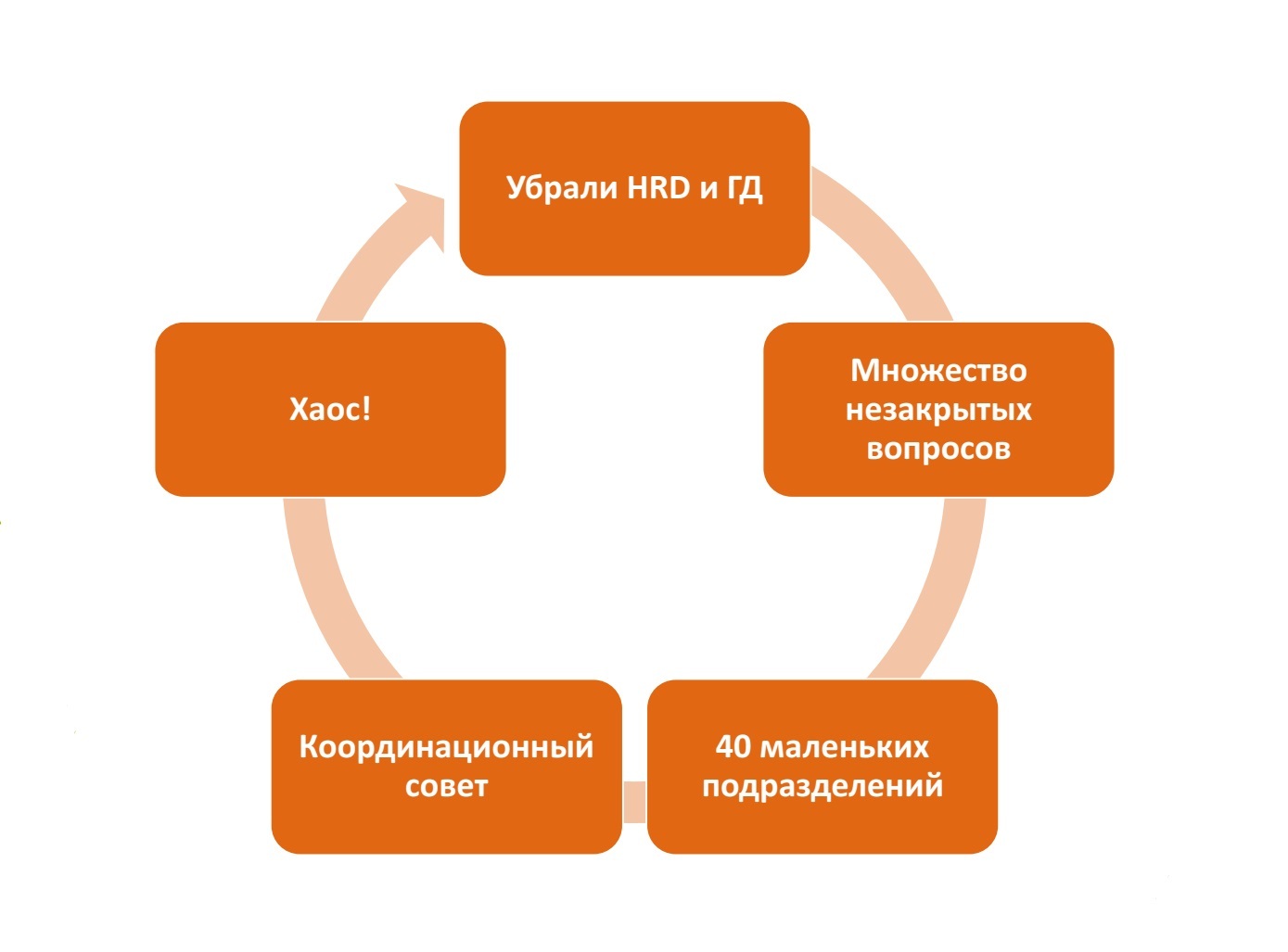 «В такой структуре я не готов работать. В мире неопределенности необходима антихрупкость. А жесткая иерархия — это структура хрупкая и неповоротливая». Структура рассыпалась на 40 подразделений. Стало не понятно куда идти, когда нужно повышать зарплату, кого увольнять. Чтобы как-то выйти из хаоса, мы создали координационный совет и пытались друг с другом договариваться.
